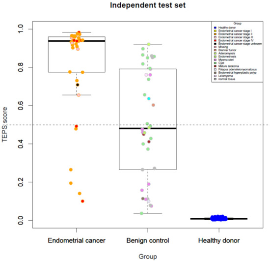 Platelet RNA sequencing and sample classification: Expression data for each sample were normalized using DESeq2 package [20] with variance stabilizing transformation [21] and then annotated with Gencode v19 GRCh37 [22]. Samples with less than 100,000 total reads were excluded from further analysis. For platelet RNA-seq profiles, we used imPlatelet classifier published by Pastuszak et al. [23]. The classifier is based on deep neural networks and yields a TEPs score that can be interpreted as a quantitative measure of the similarity of the considered transcription profile to the profile from a healthy donor (0) and patients with EC or benign gynecologic control (1) from the training cohort. In this classification, we used leave-one-out cross-validation, where in each fold, the test set consisted of one distinct sample. Cross-validated area under curve (AUC) was computed using cvAUC r package [24]. Cross-validated receiver operating characteristic (ROC) curves were generated using ROCIT r package [25].