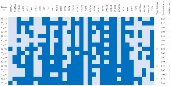 Figure 5. The summary of ctDNA sample classification compared with histology evaluation. The columns contain information regarding the genes that had nonsynonymus, stop gain or frameshift mutations in the corresponding samples (marked in dark blue). Tumor histology: 1–endometrioid, 2–non-endmetrioid.