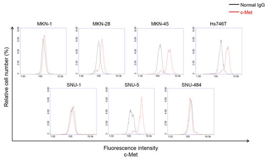 Next, we analyzed the expression level of c-Met protein on the cell surface in a number of GC cell lines (Figure 2). Based on the c-Met expression data, we classified c-Met positive or c-Met negative cells. Our data indicated that no c-Met was found on the cell in the SNU-1 and SNU484 cell lines, low levels of surface c-Met were found in MKN-1, and high levels of surface c-Met were found in MKN-28, MKN-45, SNU-5, and Hs746T.