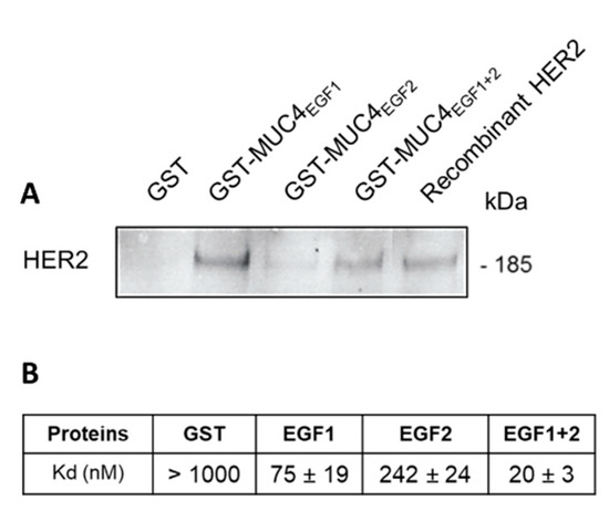 In order to show that MUC4EGFs domains are involved in direct interaction with HER2, we produced MUC4EGF1, MUC4EGF2, and MUC4EGF1+2 domains as GST fusion proteins, as previously described [10]. We first showed by GST-pull down that MUC4EGF1+2 and MUC4EGF1 domains were able to directly interact with HER2 (Figure 2A). MUC4EGF2 showed a weaker interaction. Binding affinity measurements using MST also supported the central role of MUC4EGF1 with a Kd value of 75 ± 19 nM, while MUC4EGF2 displayed a Kd of 242 ± 24 nM. The MUC4EGF1+2 combination module resulted in a better affinity (Kd = 20 ± 3 nM), close to the Kd obtained with the full MUC4β subunit (Figure 2B and Supplementary Materials Figure S3B). This result confirms that the MUC4EGF1+2 region resumes most of the binding potency of MUC4β for HER2.