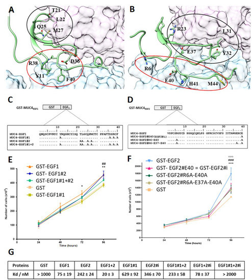 To experimentally validate the binding hotspots, we generated mutants in which each aa identified as participating in the interaction was mutated to an Ala residue (Figure 3C,D) [43]. Proliferation studies in Panc-1 human PC cells showed that mutation of cluster 1 of MUC4EGF1 (GST-EGF1#1) domain induced a statistically significant decrease in proliferation at 72 h that persisted at 96 h. Mutation of cluster 2 (GST-EGF1#2) was not as potent despite a decrease in proliferation as well (Figure 3E). Therefore, in the remainder of the manuscript, only the EGF1#1 quadruple mutant of cluster 1 was used. For the MUC4EGF2 domain, since some of the aa of EGF1#1 concentrating the maximum affinity for HER2 were of ionic nature, we focused the mutations only on aa involved in salt bridges (R6, E37, and E40). Proliferation studies clearly showed that the R6A/E37A/E40A triple mutant (GST-EGF2#R6A-E37A-E40A) induced a statistically significant decrease in proliferation at 96 h. Interestingly, the change of the triple mutant to the E37A/E40A (GST-EGF2#E37A-E40A) double mutant and E40 (GST-EGF2#i, i for ionic interaction) single mutant showed a similar decrease in proliferation (Figure 3F). This indicates that the E40A mutation is sufficient. Thus, in the remainder of the work, we used the EGF2#i mutant. MST analysis also supported the central role of the hotspots in the binding affinity measurements between GST-MUC4EGF mutants and HER2 (Figure 3G and Supplementary Materials Figure S7). Mutation of cluster1 on MUC4EGF1 (EGF1#1) clearly decreased its binding ability (Kd = 629 ± 92 nM) and resulted in a loss of affinity in the EGF1#1+2 module (Kd = 233 ± 58 nM). This mutant displayed almost the same affinity as the single MUC4EGF2 domain (Kd = 242 ± 24 nM). Mutation of ionic cluster of MUC4EGF2 (EGF2#i) resulted in a slight loss of affinity for the single MUC4EGF2 domain (Kd = 346 ± 70 nM) and raised the affinity of the EGF1+2#i module to a Kd value of 78 ± 37 nM, close to that of the single MUC4EGF1 domain (Kd = 75 ± 19 nM). The double mutant (EGF1#1+2#i), as expected, did not show any binding affinity. These results validate cluster 1 of MUC4EGF1 and ionic cluster of MUC4EGF2 as crucial binding hotspots in mediating binding affinity of MUC4 to HER2 and activation of proliferation.