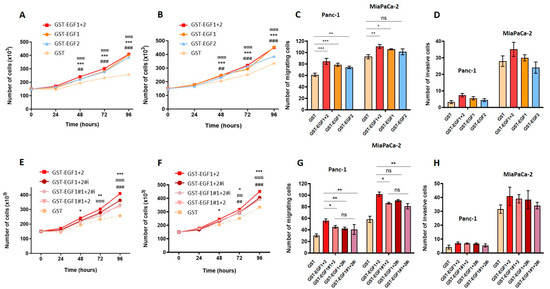 Effects of MUC4EGF1 and MUC4EGF2 domains on in vitro proliferation, migration, and invasion of human pancreatic cancer cells. Measurement of cell proliferation in Panc-1 (A) and MiaPaCa-2 (B) cells after treatment with GST-MUC4EGF1, GST-MUC4EGF2, GST-MUC4EGF1+2, or GST alone (negative control) at 1 µg/mL. (A,B): * Statistically significant difference between GST-MUC4EGF1 and GST; # statistically significant difference between GST-MUC4EGF2 and GST; ¤ statistically significant difference between GST-MUC4EGF1+2 and GST. Measurement of cell migration with Boyden chamber (control insert) (C) and cell invasion with Boyden chamber (Matrigel® insert, Corning, Glendale, AZ, USA) (D) in Panc-1 and MiaPaCa-2 cells after 24 h of treatment with GST-MUC4EGF1, GST-MUC4EGF2, GST-MUC4EGF1+2, or GST alone at 1 µg/mL. (C,D): Statistically significant differences between GST-MUC4EGF1, GST-MUC4EGF2, or GST-MUC4EGF1+2 and GST are indicated; * p < 0.05, **, ## p < 0.01, and ***, ###, ¤¤¤ p < 0.001. Measurement of cell proliferation in Panc-1 (E) and MiaPaCa-2 (F) cells after treatment with GST-MUC4EGF1+2, the mutated forms GST-MUC4EGF1#1+2, GST-MUC4EGF1+2#i, and GST-MUC4EGF1#1+2#i, or GST alone at 1 µg/mL. (E,F): Statistically significant differences between GST-MUC4EGF1+2#1 and GST-MUC4EGF1+2 (*), between GST-MUC4EGF1+2#i and GST-MUC4EGF1+2 (#), and between GST-MUC4EGF1#1+2#i and GST-MUC4EGF1+2 (¤) are indicated. Measurement of cell migration with Boyden chamber (control insert) (G) and cell invasion with Boyden chamber (Matrigel® insert) (H) in Panc-1 and MiaPaCa-2 cells after 24 h of treatment with GST-MUC4EGF1+2, GST-MUC4EGF1#1+2, GST-MUC4EGF1+2#i, GST-MUC4EGF1#1+2#i, or GST alone at 1 µg/mL. (G,H): Statistically significant differences between the mutated forms GST-MUC4EGF1#1+2, GST-MUC4EGF1+2#i, GST-MUC4EGF1#1+2#i and the wild type GST-MUC4EGF1+2 are indicated; * p < 0.05, **, ##, ¤¤ p < 0.01, and ***, ###, ¤¤¤ p < 0.001. ns: non significant.