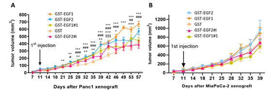 MiaPaCa-2 or Panc-1 cells (2 × 106 cells in 100 µL) were subcutaneously injected with 100 µL of Matrigel® (Corning® 354262) into flanks of male Severe Combined Immunodeficient (SCID) mice (six per group) aged 6 weeks (CB17, Charles Rivers, Ecully, France). Tumor size evaluation and follow-up was performed as before [36]. Injections (100 µL) were performed twice a week with 50 µg of GST-MUC4EGF domains (2 mg/kg) or 25 ng of hEGF (50 µg/kg), as a positive control, per mouse. Moreover, 1× PBS and GST alone (50 µg, 2 mg/kg) were also injected as negative controls. High amounts of GST-MUC4EGF1 and GST-MUC4EGF2 recombinant proteins required for in vivo experiments were produced and purified by Proteogenix SAS (Schiltigheim, France). All procedures were in accordance with the guideline of animal care committee (protocol #00423.02, Comité Ethique Expérimentation Animale Nord Pas-de-Calais, CEEA75).