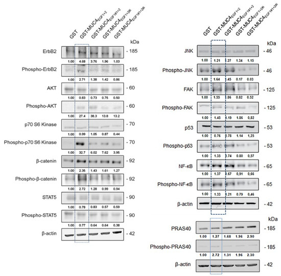 Effects of GST-MUC4EGF1+2 and their mutants on intracellular signaling pathway activity. Expression and activation (phosphorylation) of signaling proteins of interest (those activated in phosphokinase arrays, see Figure S12), by Western blotting, in Panc-1 cells treated with GST-MUC4EGF1+2, GST- EGF1#1+2, GST- EGF1+2#i, GST- EGF1#1+2#i, or GST alone. Activation levels were obtained after calculating the GST-MUC4/GST ratio normalized to β-actin.