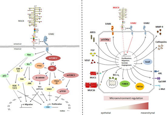 General schemes of MUC4/HER2 interaction at the membrane and subsequent activation of intracellular signaling pathways involved in cell proliferation and migration (left panel) and in oncogenic pathways (right panel).