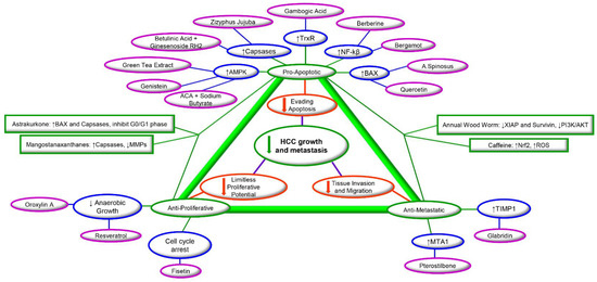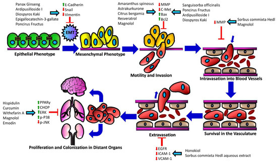 Phytochemicals target crucial molecular signaling markers involved in various key processes of HCC metastasis. Several phytochemicals inhibit specific stages of HCC metastasis, such as epithelial–mesenchymal transition (EMT), motility, invasion, intravasation, extravasation, and colonization in distant organs.