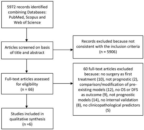 Articles were independently selected by two of the authors (D.R., P.M.) in multiple steps. First, results of different databases were crossed, and duplicates were electronically removed by EndNote v.X9 software. Subsequently, a manual check was performed to furtherly remove previous undetected duplicates. The first screening for inclusion was performed by reading title and abstract. Full assessment for eligibility was furtherly carried out by full-text reading, judging each study as included, excluded or uncertain, according to the previously listed criteria. A third reviewer (G.T.) acted as an arbiter and calculated a value of k-statistic to ascertain the level of reviewers’ agreement. In cases of disagreement, the same author (G.T.) took a final decision. From each of the selected articles, relevant information were extracted into a data extraction sheet using the TRIPOD and CHAMRS checklist, such as: author, year of publication, country where the study was carried out, the title of the paper, sample size, internal validation sample size, tumor localization sub-site, predictors (candidate and final) used to develop the models, outcome of the model (OS, DFS), method for the internal validation was carried out, modelling method, handling of missing data, model discrimination, model calibration, model presentation, handling of continuous predictors, presence of external validation, type of study.