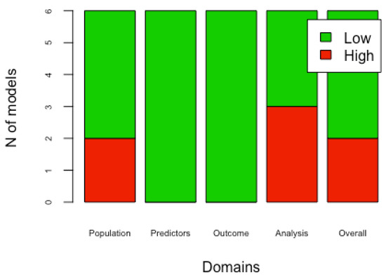 The recognition of the methodological limitations found in the developed models and their external validation were evaluated as a high risk of bias, as indicated in the PROBAST. Domain four (analysis domain) is the one that most influenced the overall risk of bias [16,51].