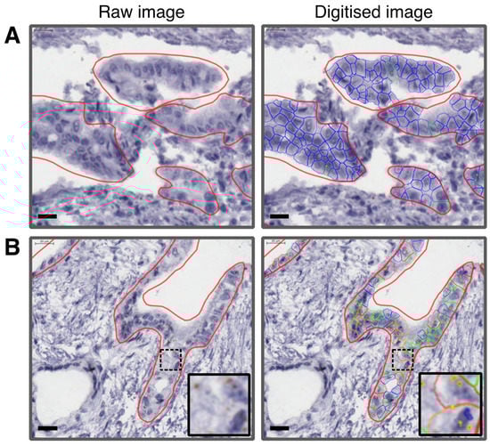 Representative images of tissue cores showing CDA mRNA expression before and after SpotStudio® analysis. (A) Raw and digitized images of tissue expressing low CDA mRNA. (B) Raw and digitized images of tissue expressing high CDA, with inset example of cells with high CDA expression. Thick red line surrounds areas with tumor cells. Blue lines = Cells without any spots. Green lines = Cells with one single spot. Orange lines = Cells with between two and five spots. Thin red lines = Cells with six or more spots. Scale bar = 20 µm.
