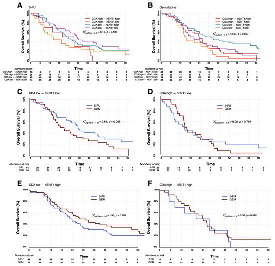 Kaplan-Meier survival curves for analyses of combined CDA mRNA and hENT1 protein biomarker interaction looking at all expression level combinations (CDA low, hENT1 low; CDA high, hENT1 low; CDA low, hENT1 high; CDA high, hENT1 high). Graphs show response to treatment with 5-FU (A) and gemcitabine (B). In (C,D) the same data as above is presented showing the difference in survival for patients treated with 5-FU compared to gemcitabine in patients with low hENT1 protein and either low CDA (C) or high CDA (D), and patients with high hENT1 protein and either low CDA (E) or high CDA (F). All groups and the number of at-risk individuals are shown for each graph. All p-values were determined by log-rank analyses using two-sided χ2 tests.