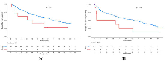 Follow-up time for overall survival (OS) was defined as the time from the date of the first diagnosis until death. Patients without an event were censored at last contact or at the end of the observation period if the patient was still alive. In cases in which a date of primary diagnosis was not available (e.g., external diagnosis), the date of the first diagnosis was set to the date of the surgical therapy. Recurrence-free survival (RFS) was defined as the time from primary treatment to recurrence (within 5 years) or the date of death. The follow-up time for RFS was the time until diagnosis of relapse or until death or last contact in the respective treating departments. Patients were not considered for the recurrence analysis and classified as residual tumors when diagnosis was made within 6 months after primary surgery (± adjuvant therapy) with R1/Rx resection margins.