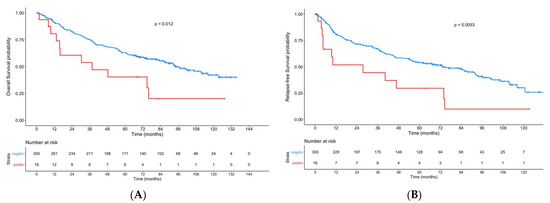 When combining patients with an ERα-positive lymph node metastasis and/or primary tumor, we found significant lower OS (p = 0.012) and RFS (p = 0.0053) in the case of ERα positivity compared to ERα-negative patients (Figure 3).