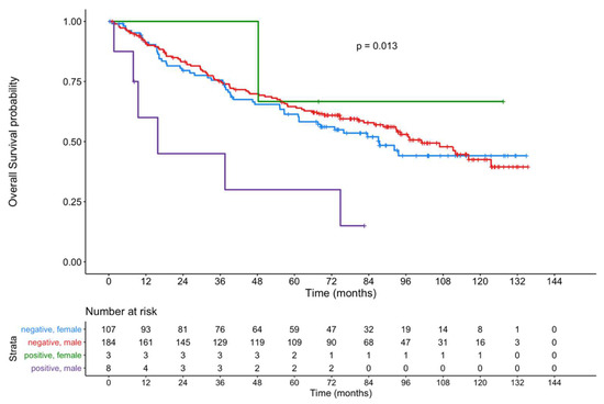 Figure 5 shows the OS of male and female patients with an ERα-positive primary tumor compared to patients with ERα-negative tumors. Within the limitations due to the small number of positive female patients, a significant difference (p = 0.013) was observed.