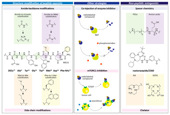 However, the preclinical development and search for optimal CCK2R targeting probes is still ongoing. A major issue remains metabolic stability, possibly affecting the tumor uptake and retention. Therefore, various attempts for further optimization of the peptide sequence are pursued currently. Other strategies to improve tumor uptake are directed towards enhancing the CCK2R expression or increasing the radiation dose at the tumor sites. Furthermore, nonpeptidic compounds have been developed recently in an attempt to improve tumor uptake and retention in combination with low kidney retention. These developments are summarized in Figure 1 and described more in detail in the following section.