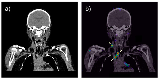 CT (a) and fused [111In]In-CP04 SPECT/CT (b) images in coronar orientation. Neck lymph node metastases and tumor infiltration around the tracheotomy tube (arrows) in a female patient with MTC are visible; images performed 24 h after injection of 210 MBq (50 µg peptide). Scan was performed within GRAN-T-MTC (ERA-NET on Translational Cancer Research (TRANSCAN), First Joint Transnational Call (JTC 2011) on: “Validation of biomarkers for personalised cancer medicine”, funded by the European Commission under the Seventh Framework Programme (FP7) with the following national co-found institutions: Ministry of Health (MoH), Italy, National Centre for Research and Development (NCBiR), Poland, Federal Ministry of Education and Research (BMBF), Germany, Austrian Science Fund (FWF, Project No. I1224-B19), Austria, Ministry of Higher Education, Science and Technology (MHEST), Slovenia, and General Secretariat for Research and Technology, Ministry of Education, Life Long Learning and Religious Affairs (GSRT), Greece.