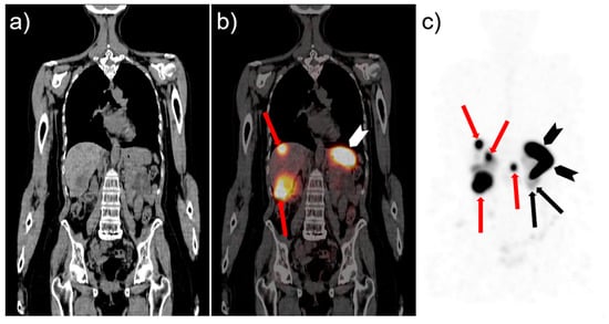 The first experience with the novel 68Ga-labeled minigastrin analog [68Ga]Ga-DOTA-MGS5 in comparison to [18F]FDOPA was described by Uprimny et al. in 2021 in a female patient with advanced MTC. PET/CT with [68Ga]Ga-DOTA-MGS5 vs. [18F]FDOPA showed less cervical lymph node and bone metastases with lower SUV values (lymph nodes 1 vs. 2, SUVmax 3.4 and 2.6 (1/2 h p.i.) vs. 11.7; bone metastasis 1 vs. 3, SUVmax 1.6 and 2.3 (1/2 h p.i.) vs. 4.0). However, [68Ga]Ga-DOTA-MGS5 allowed a better discrimination of liver lesions (SUVmax 6.4 and 8.3 (1/2 h p.i.) vs. 3.73), three additional metastases were found, and physiological liver activity was lower resulting in higher tumor/non-tumor ratios [65]. In Figure 3 PET/CT imaging with [68Ga]Ga-DOTA-MGS5 PET/CT in a male patient with advanced MTC is presented, showing several liver lesions.