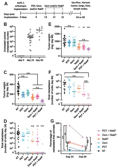 3.3. PDT + Nab-Paclitaxel Cytoreduces Established Metastases in an Aggressive Late-Stage Model of PDAC
