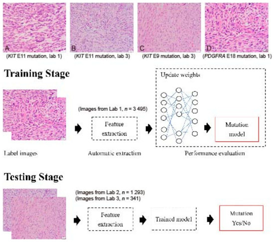 In this study gastrointestinal stromal tumors (GISTs) were chosen to be the subject because: (1) GIST is the most common mesenchymal malignancy of the gastrointestinal tract, and reducing the patients’ waiting time has significant clinical impact. (2) The target gene of this tumor, KIT or the PDGFRA receptor tyrosine kinase gene, has a complex pattern of mutation, which makes morphology–genotype correlation extremely difficult for human perception. (3) Most of the GISTs show consistent morphological features across the whole tumor, making it easy to obtain representative microscopic images. This exempts pathologists from the need for submitting whole-slide images and greatly enhances the efficiency of data transmission. (4) The target gene, KIT/PDGFRA, is the major protein-producing gene in GIST, and mutation of this gene is expected to generate considerable morphological variation, which may facilitate detection. (5) Deep learning studies into mesenchymal tumors are rare [2], and mesenchymal tumors arise from an extremely heterogenous group of diseases, with a few cases in each category in open image databases. (6) In GISTs, the subtype of mutations present is more important than the presence of mutation itself. For example, mutations in exon 11 of the KIT gene are usually drug-sensitive, while mutations in exon 9 are usually drug-resistant [7]. Genotype–phenotype studies relating mutational subtypes to histology have rarely been performed.