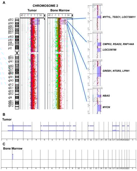 DNAs from primary NB and metastatic bone marrow aspirate cells were tested by high-resolution oligonucleotide a-CGH using the 4 × 180 K Kit (Agilent Technologies, Santa Clara, CA, USA) with a mean resolution of approximately 25 kb []. Each hybridization produced a pair of 16-bit images, which were processed using the Agilent Feature Extraction 10.5 Software. The data were analyzed using the Genomic Workbench 7.0.40 software (Agilent Technologies, Santa Clara, CA, USA), the altered chromosomal regions and breakpoints events were detected using ADM-1 (threshold 10) with 0.5 Mb window size to reduce false positives []. Amplifications were defined at loci with log2 ratio ≥ 2, and loci with log2 ratio ≥3.5 were considered as high-level amplifications. Chromosome positions were determined using GRCh38/hg19 (UCSC Genome Browser, http://genome.ucsc.edu, accessed on 10 June 2021. The chromosomal copy number variations present in the Database of Genomic Variants (DGV: http://projects.tcag.ca/variation/, accessed on 28 July 2021) were taken into consideration only with a frequency <5%. The raw data were stored in the BIT-NB (Biobank Integrated Tumor—Neuroblastoma) Genomic Section of IRCCS G. Gaslini.