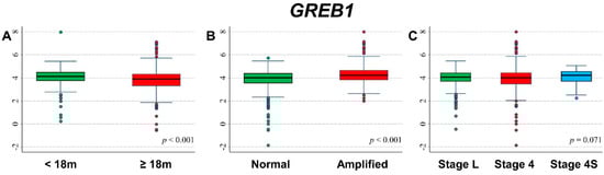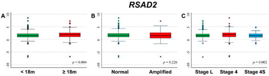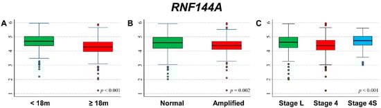 Association between patient characteristics at diagnosis and RNF144A expression levels are shown in Figure 2. Statistically significant higher values were observed for patients diagnosed before 18 months of age (Figure 2A), with normal MYCN status (Figure 2B), and with localized stages or stage 4S (Figure 2C).