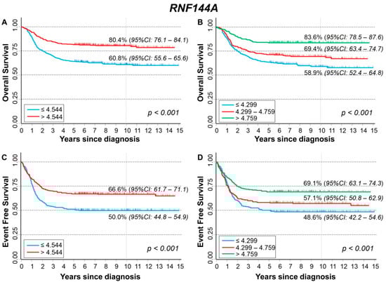 Patient Survival in relation to RNF144A expression level. Overall Survival of 786 NB patients with (A) cut-off based on the median expression value or (B) on tertile expression values. Event Free Survival of 769 NB patients with (C) cut-off based on the median expression value or (D) on tertile expression values. Ten-year survival estimates are displayed.