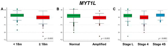 The comparisons between MYT1L expression levels by patient characteristics at diagnosis are displayed in Figure 4. Lower values were associated with older age (Figure 4A), amplified MYCN status (Figure 4B), and stage 4 disease (Figure 4C).