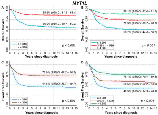 Patient Survival in relation to MYT1L expression level. Overall Survival of 786 NB patients with (A) cut-off based on the median expression value or (B) on tertile expression values. Event Free Survival of 769 NB patients with (C) cut-off based on the median expression value or (D) on tertile expression values. Ten-year survival estimates are displayed.
