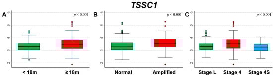 Figure 6 shows the comparison between TSSC1 expression levels by patient’s characteristics at diagnosis. Higher expression values were associated with older age (Figure 6A), amplified MYCN status (Figure 6B), and stage 4 disease (Figure 6C).