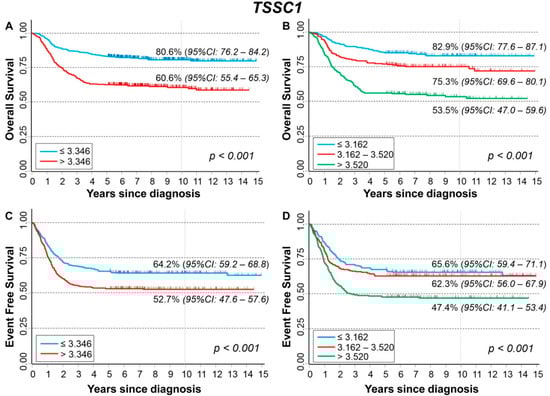 Patient Survival in relation to TSSC1 expression level. Overall Survival of 786 NB patients with (A) cut-off based on the median expression value or (B) on tertile expression values. Event Free Survival of 769 NB patients with (C) cut-off based on the median expression value or (D) on tertile expression values. Ten-year survival estimates are displayed.