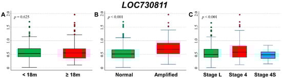 Association between LOC730811 expression and the main patient characteristics at diagnosis. (A) Age; (B) MYCN status; (C) Stage.