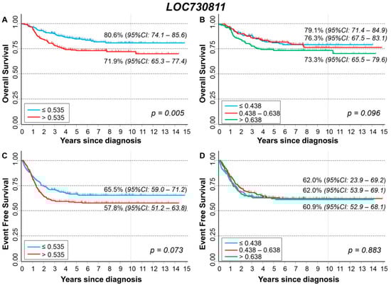 Patient Survival in relation to LOC730811 expression level. Overall Survival of 498 NB patients with (A) cut-off based on the median expression value or (B) on tertile expression values. Event Free Survival of 498 NB patients with (C) cut-off based on the median expression value or (D) on tertile expression values. Ten-year survival estimates are displayed.