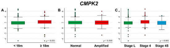 Association between CMPK2 gene expression and the main patient characteristics at diagnosis. (A) Age; (B) MYCN status; (C) Stage.