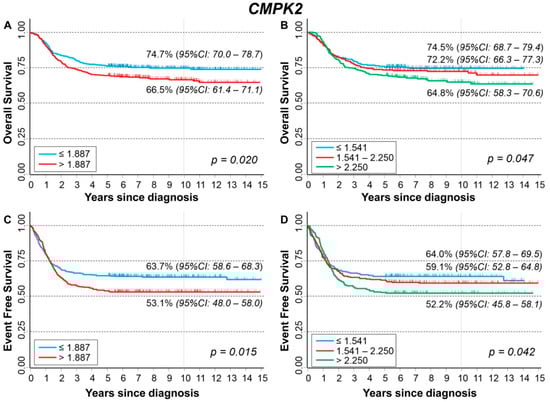 Patient Survival in relation to CMPK2 expression level. Overall Survival of 786 NB patients with (A) cut-off based on the median expression value or (B) on tertile expression values. Event Free Survival of 769 NB patients with (C) cut-off based on the median expression value or (D) on tertile expression values. Ten-year survival estimates are displayed.