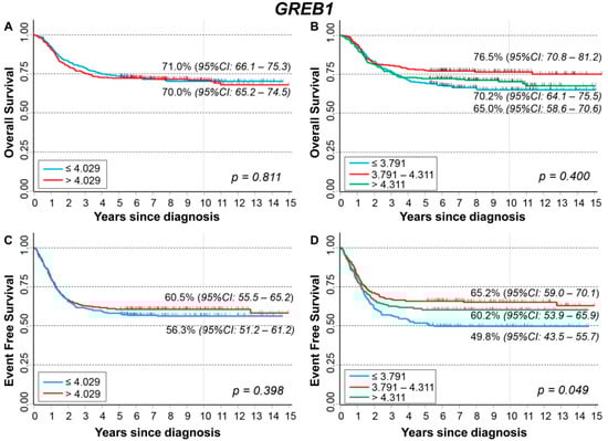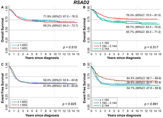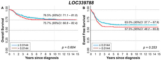 Figure 9 shows the OS of the whole cohort (n = 498) in relation to LOC730811 long non-coding mRNA expression. A slightly poorer survival was associated with higher values of expression (Figure 9A) but without any evidence of trend (Figure 9B). After adjusting for the available confounding factors in multivariable Cox regression analysis, no association was observed (Table 8). After stratification by MYCN status (Table S14) and by stage at diagnosis (Table S15), no association between expression level and OS emerged. About EFS, no statistically significant association was found splitting the cohort on the basis of either the median (Figure 9C) or the tertile expression values (Figure 9D). The multivariable Cox regression analysis confirmed the lack of association between expression levels and EFS (Table 9). The results from the stratified analysis by MYCN status (Table S16) and by stage at diagnosis (Table S17) did not find any evidence of a potential impact of LOC730811 on EFS.