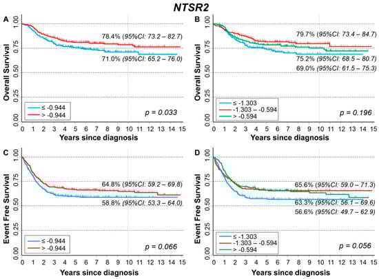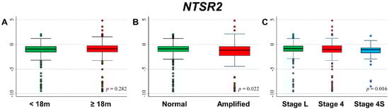 Analysis involving NTSR2 gene and LOC339788 and LOC730811 loci were performed using the gene expression profile of 709 and 498 NB tumor samples generated by Agilent customized 4 × 44 K oligonucleotide microarray [] and Illumina HiSeq 2000 platform [], respectively. Gene expression and clinical data included in these datasets were publicly accessible through the ArrayExpress (http://www.ebi.ac.uk/arrayexpress; accession: E-MTAB-1781, accessed on 20 June 2021) and the Gene Expression Omnibus (http://www.ncbi.nlm.nih.gov/geo; accession: gse62564, accessed on 20 June 2021) databases.