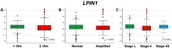 Among patients ≥ 18 months at diagnosis, with MYCN amplified tumor and Stage 4 disease (Figure S18A–D), no association was found between LPIN1 expression levels and patient survival.