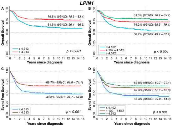 Patient Survival in relation to LPIN1 expression level. Overall Survival of 786 NB patients with (A) cut-off based on the median expression value or (B) on tertile expression values. Event Free Survival of 769 NB patients with (C) cut-off based on the median expression value or (D) on tertile expression values. Ten-year survival estimates are displayed.