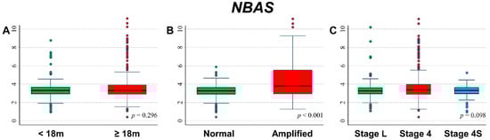 Association between NBAS gene expression and the main patient characteristics at diagnosis. (A) Age; (B) MYCN status; (C) Stage.