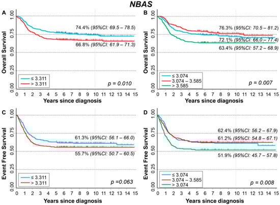 Patient Survival in relation to NBAS expression level. Overall Survival of 786 NB patients with (A) cut-off based on the median expression value or (B) on tertile expression values. Event Free Survival of 769 NB patients with (C) cut-off based on the median expression value or (D) on tertile expression values. Ten-year survival estimates are displayed.
