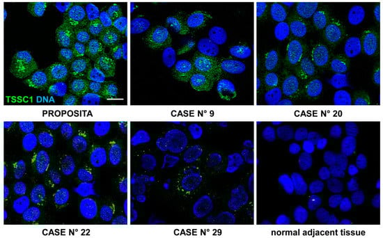In order to evaluate TSSC1 protein expression, we performed immunofluorescence analysis of the proposita tumor tissue and of other 30 stage 4 NB biopsy tissue samples at the onset of disease. The results of TSSC1 protein expression analysis in the observed specimens revealed that TSSC1 was mainly expressed in the cytoplasm and showed low expression in adjacent normal tissue. TSSC1 expression was estimated by evaluating the proportion of positively stained NB cells. TSSC1 was found expressed with a high percentage of positive cells (>85%) in the proposita NB tissue. Similarly, all relapsed or dead stage 4 NB showed many TSSC1 positive cells in their tumor tissues, while NB in complete remission expressed a lower amount of TSSC1 positive cells (Figure 23 and Table 25). In more detail, the median value was 12.5 among the not relapsed patients and 67.5 among the relapsed ones (p < 0.001, Mann–Whitney U test); 11.5 among the 10 alive patients and 67.58 among the 20 deceased ones (p < 0.001) (Figure S21).