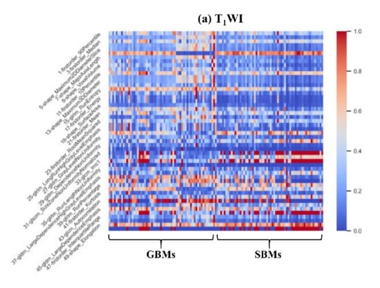 The fused feature of T1WI and T2_FLAIR (i.e., via the proposed RFO model (generated in the feature level fusion) was shown to further enhance the discriminative power in differentiating GBM vs. SBM, especially when compared with the corresponding features from either T1WI or T2_FLAIR (Figure 7).