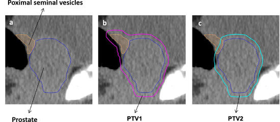 - Salembier, C.; Villeirs, G.; De Bari, B.; Hoskin, P.; Pieters, B.R.; Van Vulpen, M.; Khoo, V.; Henry, A.; Bossi, A.; De Meerleer, G.; et al. ESTRO ACROP consensus guideline on CT- and MRI-based target volume delineation for primary radiation therapy of localized prostate cancer. Radiother. Oncol. 2018, 127, 49–61. [Google Scholar] [CrossRef]