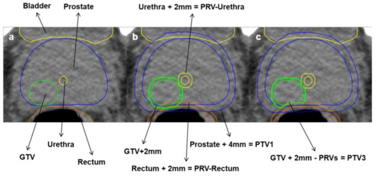 Definition of PTV3 for SBRT. Planning target volume 3 (PTV3) is created by of 0–2mm isotropic extension of the gross tumour volume (GTV) (a,b). Overlapping parts with planning organ at risk volume (PRV) of rectum and urethra are removed from PTV3 (c).