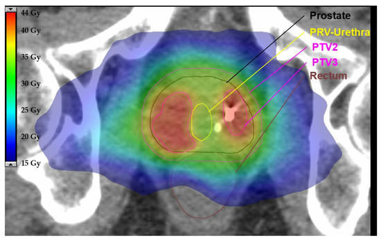 - Michalski, J.M.; Moughan, J.; Purdy, J.; Bosch, W.; Bruner, D.; Bahary, J.-P.; Lau, H.; Duclos, M.; Parliament, M.; Morton, G.; et al. Effect of Standard vs. Dose-Escalated Radiation Therapy for Patients with Intermediate-Risk Prostate Cancer: The NRG Oncology RTOG 0126 Randomized Clinical Trial. JAMA Oncol. 2018, 4, e180039. [Google Scholar] [CrossRef]