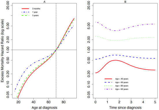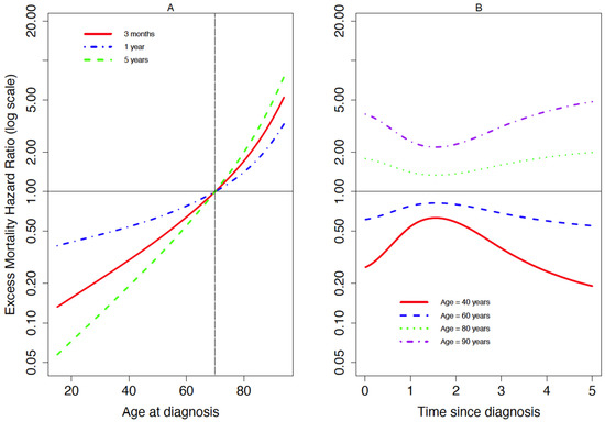 For FL (Figure 2), the non-linear effect of age was almost similar whatever the time since diagnosis; being older was associated with a higher excess mortality hazard (Figure 2A). For those of older or younger ages, in comparison to 70-year-olds, the EMHR was markedly different immediately after or at 5 years since diagnosis but was most similar around 18 months after diagnosis (Figure 2B).