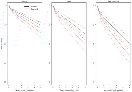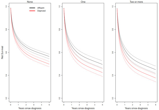 Net survival model-based prediction for follicular lymphoma for each comorbidity status by deprivation level (n = 15,516) in England between 2005 and 2013. The values here are presented for 70-year-old white males diagnosed via a general practitioner referral. Values will change for other covariates, but the pattern observed here will remain.