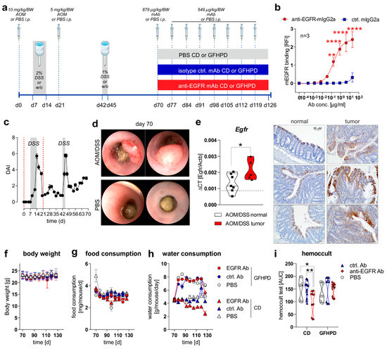 EGFR expression is elevated in CRC tumors and anti-EGFR Ab treatment reduces fecal occult blood levels in AOM/DSS-treated mice. (a) Schematic overview of induction of colitis-driven colorectal carcinomas by AOM/DSS treatment in female C57BL/6J mice (n = 88) between days 0 and 70. Control mice received PBS instead of AOM/DSS (n = 19) between days 0 and 70. At day 70, indicator mice (n = 9 AOM/DSS-treated; n = 8 PBS-treated) were sacrificed and tissues were sampled for further analysis. Remaining AOM/DSS-treated mice were further subdivided at day 70 into two different dietary intervention groups receiving control diet (CD; n = 39) or glucose-free, high-protein diet (GFHPD; n = 40) until day 126. Dietary interventions were performed in the presence or absence of weekly intraperitoneal (i.p.) application of PBS (n = 9 CD; n = 9 GFHPD), anti-EGFR Ab (n = 15 CD; n = 16 GFHPD) or a ctrl. antibody (n = 15 CD; n = 15 GFHPD) between day 70 and 126. PBS-treated control mice were fed either CD (n = 5) or GFHPD (n = 6) between day 70 and 126. AOM = azoxymethane; DSS = dextran sodium sulfate; anti-EGFR-mAb = 7A7-mIgG2a; isotype ctrl. mAb = irrelevant mIgG2a; mAb = monoclonal Ab. (b) Concentration-dependent binding of anti-EGFR-mIgG2a or ctrl.-mIgG2a to recombinant murine EGFR was analyzed by ELISA experiments. Mean ± SEM of three independent experiments is presented. (c) Disease activity index (DAI) of AOM/DSS-treated mice (n = 88) from day 0 to 70. (d) Representative images of endoscopy analyses of AOM/DSS or PBS-treated indicator mice at day 70. (e) Egfr mRNA expression was quantified by qPCR and related to Actb mRNA expression in normal or tumor colonic tissues collected from AOM/DSS-treated mice at day 70. Grey dotted line indicates median values of PBS-treated control mice at day 70 (left panel). Representative images of immunohistochemistry staining of EGFR in paraffin-embedded normal and tumor colonic biopsies (n = 3 each) were collected from AOM/DSS-treated mice at day 70 (right panel). Scale bar = 50 µM. (f–h) Body weight, food consumption, and water consumption were routinely monitored between days 70 and 126. (i) Fecal occult blood was determined every second day using a hemoccult test. Results are presented as the area under the curve (AUC) from analyzed mice. * p ≤ 0.05, ** p ≤ 0.01. **** p ≤ 0.0001.