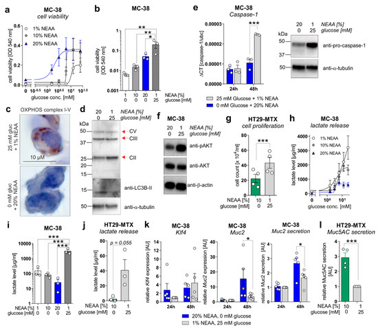 A metabolic shift from aerobic glycolysis towards amino acid metabolism inhibits proliferation but enhances goblet cell differentiation of CRC cell lines in vitro. (a,b) MC-38 cells were incubated in culture media containing increasing concentrations of D-glucose (0–25 mM) in the presence of 1%, 10%, or 20% NEAA. After 72 h, cell viability was determined by neutral red cytotoxicity assay. (c) Representative images of immunohistochemistry staining of paraffin-embedded MC-38 cells after 48 h cultivation under standard (25 mM glucose + 1% NEAA) or glucose-free (0 mM glucose + 20% NEAA) conditions, utilizing an antibody cocktail against OXPHOS complexes I–V. (d) MC-38 cells were incubated in standard culture medium (25 mM glucose, 1% NEAA) or in glucose-free plus 20% NEAA medium for 48 h. Expression of OXPHOS complexes II, III, and V or LC3B were analyzed by Western blot experiments. Alpha-Tubulin expression served as a loading control (representative images of n = 3 independent experiments). (e) MC-38 cells were incubated in a standard culture medium (25 mM glucose, 1% NEAA) or glucose-free plus 20% NEAA medium for 24 or 48 h. Caspase-1 mRNA expression was quantified by qPCR experiments and related to Ubc mRNA expression (left panel; n = 3 independent experiments). Caspase-1 protein expression after 48 h of incubation was analyzed by Western blot experiments. Alpha-Tubulin expression served as a loading control (right panel; representative images of n = 3 independent experiments). (f) Protein levels of phosphorylated AKT and AKT were determined after 48 h of incubation of MC-38 cells under indicated culture conditions by Western blot experiments. β-actin expression served as a loading control. Representative images of n = 3 independent experiments. (g) HT29-MTX cells were incubated for 72 h under indicated culture conditions and cell count was determined. Mean ± SEM of four independent experiments is presented. (h,i) MC-38 cells were incubated under indicated culture conditions. After 72 h, L-lactate levels were quantified in cell culture supernatants. (j) L-lactate release by HT29-MTX cells after 72 h of incubation under indicated culture conditions. L-lactate concentrations were related to the respective cell count presented in (g). Mean ± SEM of three independent experiments is presented. (k) MC-38 cells were incubated in standard culture medium (25 mM glucose, 1% NEAA) or in glucose-free plus 20% NEAA medium for 24 or 48 h. Klf4, Muc2, or Ubc mRNA expression was quantified by qPCR experiments (n = 3 independent experiments). ΔCT values were calculated by normalization of Klf4 or Muc2 to Ubc and related to values received from standard culture conditions at 24 h. Muc2 secretion was analyzed after 72 h of incubation in cell culture supernatants from respective cells by ELISA experiments. Data are related to cell viability determined by neutral-red cytotoxicity assay and presented as mean ± SEM. (l) Muc5AC release by HT29-MTX cells was measured after 72 h of incubation and related to respective cell counts. Values were normalized to Muc5AC secretion observed for standard culture conditions. * p ≤ 0.05, ** p ≤ 0.01. *** p ≤ 0.001. AU = arbitrary units.