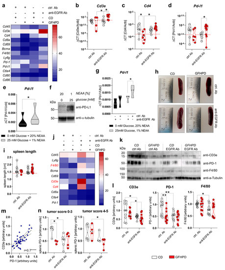 GFHPD and anti-EGFR Ab treatment reduce tumoral Pd-l1 expression and PD-1 expressing T cells. (a–d) QPCR analyses were performed to quantify mRNA expression level of Cd45, Cd3e, Cd4, Cd8a, Cd69, Bcma, F4/80, Ly6g, Pd-1, Pd-l1, Ctla4, Cd80, or Cd86 in colonic tissues collected from indicated treatment groups of AOM/DSS mice. Results are based on ΔCT calculation including relation to β-actin mRNA expression. Heatmap was generated based on normalized values (%) per transcript. The mean value per group is presented. n = 6–7 ctrl. Ab and CD; n = 6–7 anti-EGFR Ab and CD; n = 4–6 ctrl. Ab and GFHPD; n = 6–9 anti-EGFR Ab and GFHPD. Red dotted horizontal lines represent respective median values of PBS-treated control mice at day 126. (e,f) MC-38 cells were incubated in standard culture medium (25 mM glucose, 1% NEAA) or glucose-free plus 20% NEAA medium for 48 h. (e) Pd-l1 mRNA expression was quantified by qPCR experiments and related to Ubc mRNA expression (n = 5 independent experiments), while (f) PD-L1 protein expression was analyzed by Western blot experiments. Alpha-Tubulin expression served as a loading control (representative images of n = 5 independent experiments). (g) MC-38 cells were incubated in standard culture medium (25 mM glucose, 1% NEAA) or in glucose-free plus 20% NEAA medium in the presence or absence of either the anti-EGFR Ab 7A7-mIgG2a or the irrelevant control Ab CD19-mIgG2a for 48 h. Pd-l1 mRNA expression was quantified by qPCR experiments and related to Ubc mRNA expression (n = 3 independent experiments). (h) Representative images from spleens collected from AOM/DSS-treated mice at day 126. (i) Representative spleen lengths were measured for indicated treatment groups. n = 9 ctrl. Ab and CD; n = 9 anti-EGFR Ab and CD; n = 6 ctrl. Ab and GFHPD; n = 11 anti-EGFR Ab and GFHPD. Red dotted horizontal line represents median values of PBS-treated control mice at day 126. (j) QPCR analyses were performed to quantify mRNA expression levels of Cd45, Ly6g, F4/80, Bcma, Cd69, Cd3e, Cd4, Cd8a, Ctla4, and Pd-1 in splenic tissues collected from indicated treatment groups of AOM/DSS mice. Results are based on 2−ΔCT calculation, including relation to β-actin mRNA expression. Heatmap was generated based on normalized values (%) per transcript. The mean value per group is presented. n = 10 ctrl. Ab and CD; n = 10 anti-EGFR Ab and CD; n = 10 ctrl. Ab and GFHPD; n = 11 anti-EGFR Ab and GFHPD. (k) Splenic CD3e, PD-1, and F4/80 protein expression levels were determined by Western blot experiments. Alpha-Tubulin expression served as a loading control. (l) Densitometric analyses were performed using ImageJ software. n = 10 ctrl. Ab and CD; n = 10 anti-EGFR Ab and CD; n = 10 ctrl. Ab and GFHPD; n = 11 anti-EGFR Ab and GFHPD. (m) Splenic PD-1 protein expression was related to splenic CD3e protein expression. (n) Splenic PD-1 protein expression is displayed in relation to colorectal tumor scores (smaller tumor 0–3; larger tumor 4–5). * p ≤ 0.05, ** p ≤ 0.01, **** p ≤ 0.0001.