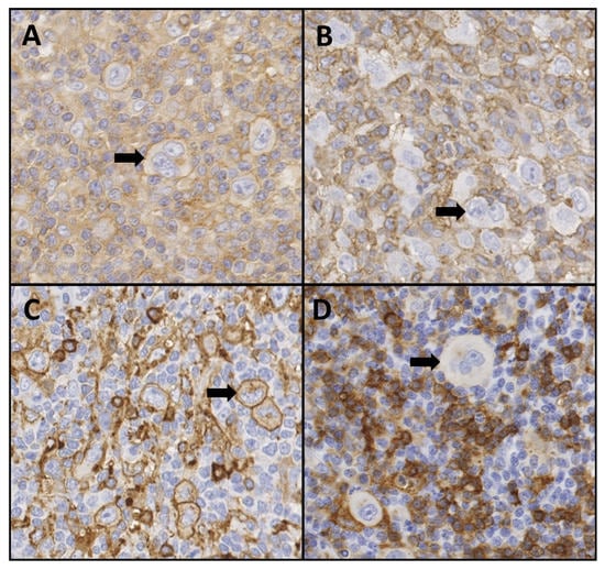 Representative images of immunohistochemistry staining for B2M and HLA class II in classic Hodgkin lymphoma tissue. Scoring is based on staining of the cell membrane of Hodgkin and Reed Sternberg cells. (A) B2M positive, (B) B2M negative, (C) HLA class II positive, (D) HLA class II negative. Arrows indicate representative HRS cells. 40× magnification.